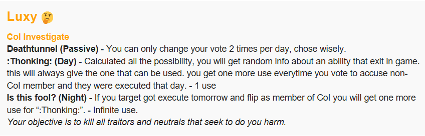 I am not traitor! (Passive) - You appear as member of CoI for the first 3 night.
